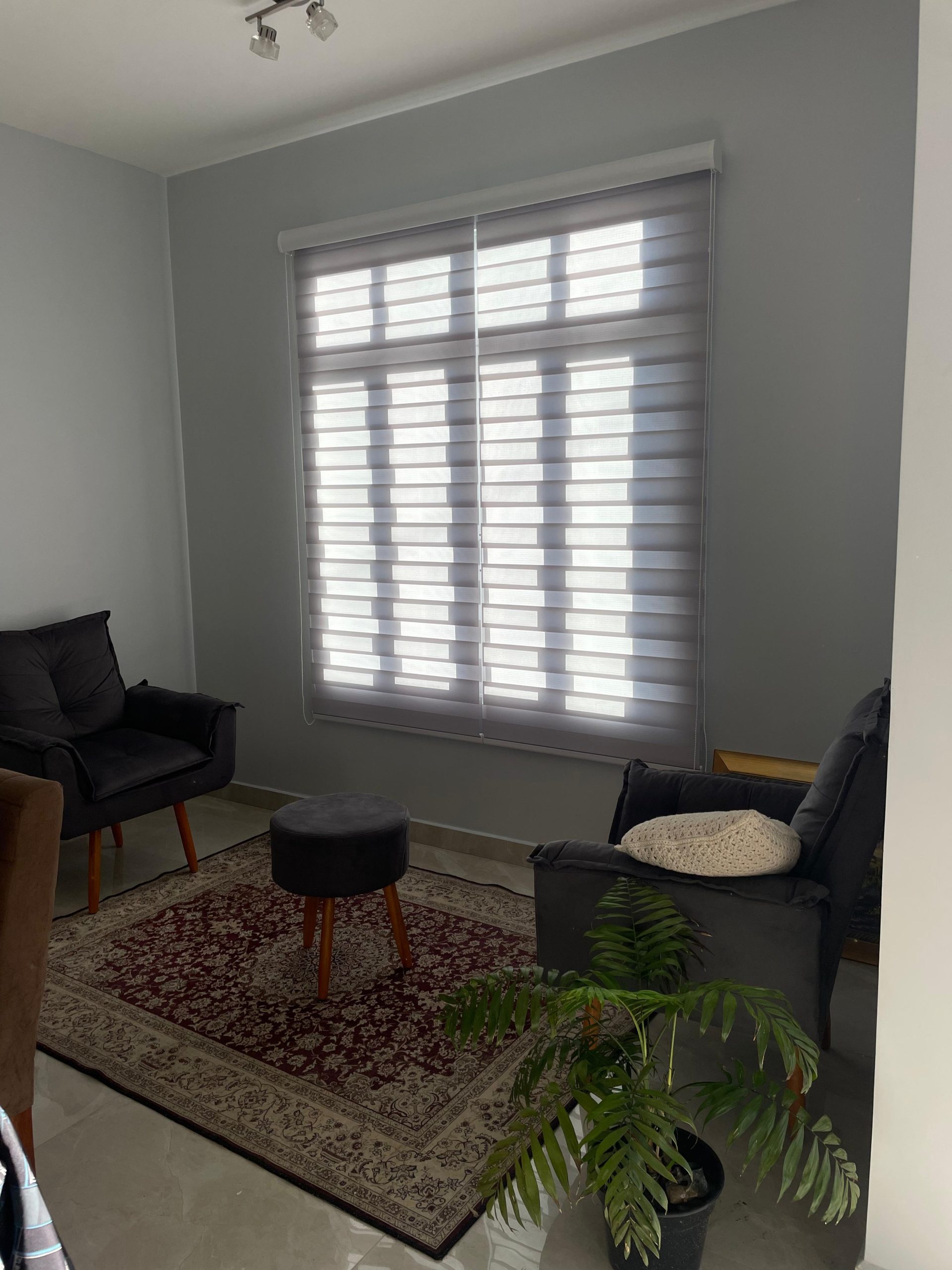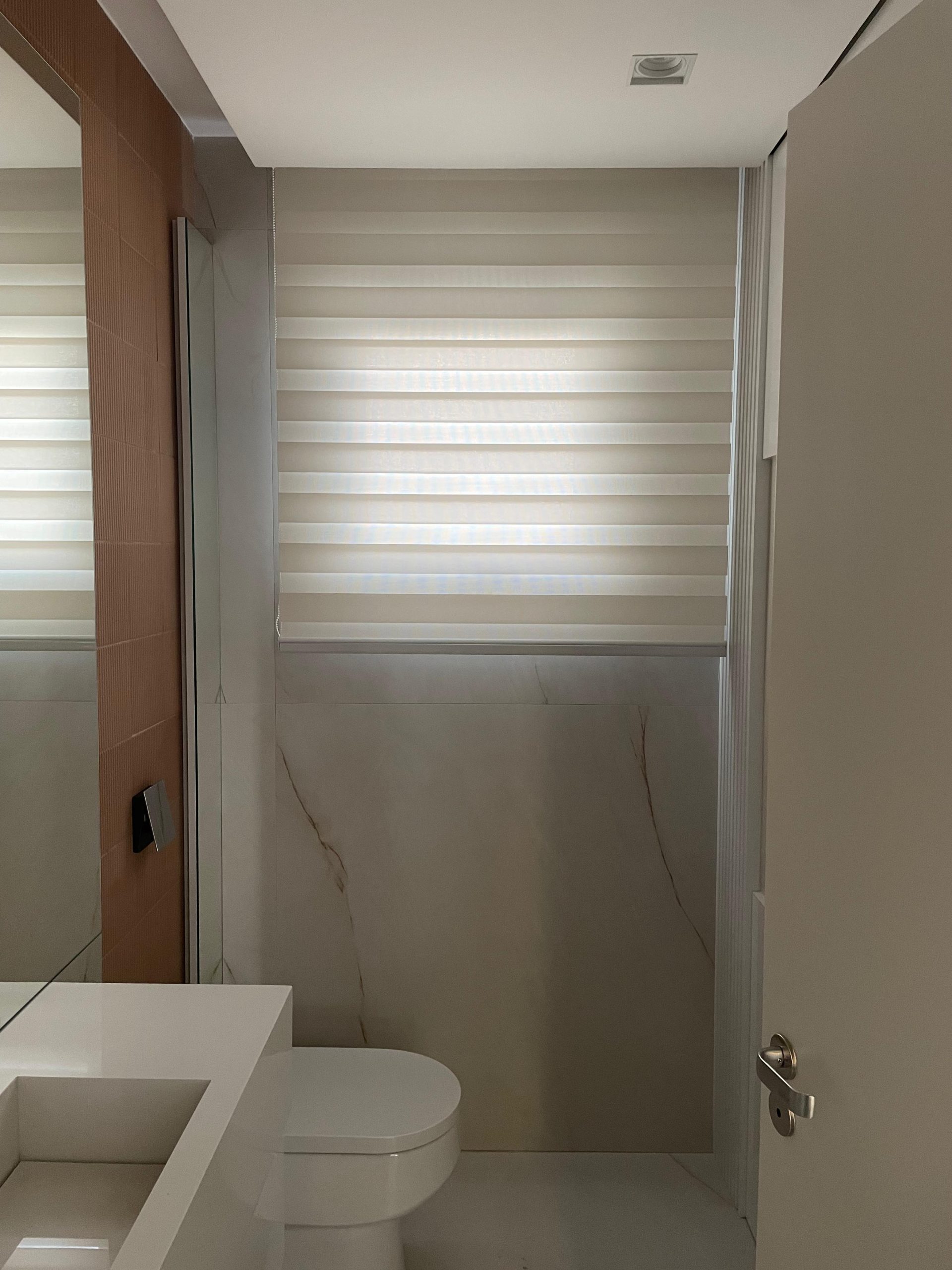 Destaca-se por sua tecnologia e design. Fabricada em tecido tecnológico, 100% poliéster, de alta resistência e com duas faixas visuais distintas. Uma transparente e a outra fechada. Com as faixas abertas permite a visibilidade externa e fechadas garantem a privacidade. Charme e requinte em qualquer posição. Proteção contra os raios UV de 99% na posição fechada e 87% quando entreaberta.
